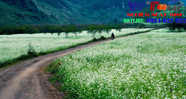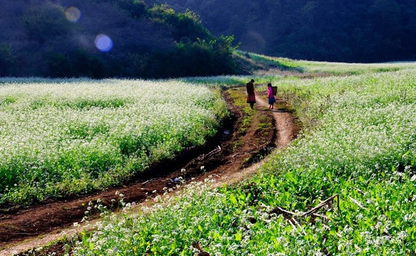 Mùa hoa tam giác mạch trôi qua nhanh như một giấc mơ, dân yêu hoa, yêu vùng cao lại có thể ngao du đến Mộc Châu để ngắm nghía mùa hoa cải trắng. Không rực rỡ, nồng nàn như mùa cải vàng, hoa cải trắng nhẹ nhàng, tinh khôi hơn. Mỗi đoá hoa trắng phau như những nhúm bông nhỏ, được đặt trên cành hoa xanh non. Nhìn nom rất bé nhỏ, rất giản dị, nhưng phải đến khi bạn thấy loài cây này phủ trắng bạt ngàn những thảo nguyên, mộng mơ như thể mây rơi xuống đất và đọng lại trên lá cây, bạn mới thấy được vẻ đẹp như cõi tiên khi mùa hoa cải trắng ùa về.